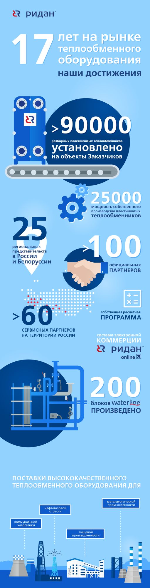 Сегодня нашей компании исполняется 17 лет! Для человека это возраст юности и самое начало жизненного пути, а в масштабе компании это солидная дата, когда можно подвести промежуточные итоги и поделиться многолетним опытом развития. Начав свое существование с небольшого производства в Нижегородской области, за 17 лет «Ридан» стал одним из ведущих производителей теплообменного оборудования в России: с современным производственным комплексом, широким региональным присутствием, сетью Партнёров по всей стране. Мы хотим поделиться инфографикой, которая наглядно показывает, каких результатов «Ридан» удалось достичь к сегодняшнему дню. Несмотря на то, что многое уже достигнуто, мы уверены, что главные достижения компании «Ридан» еще впереди! Кроме того, мы выражаем огромную благодарность нашим Партнерам и Заказчикам, ведь наш успех во многом зависит от вас!