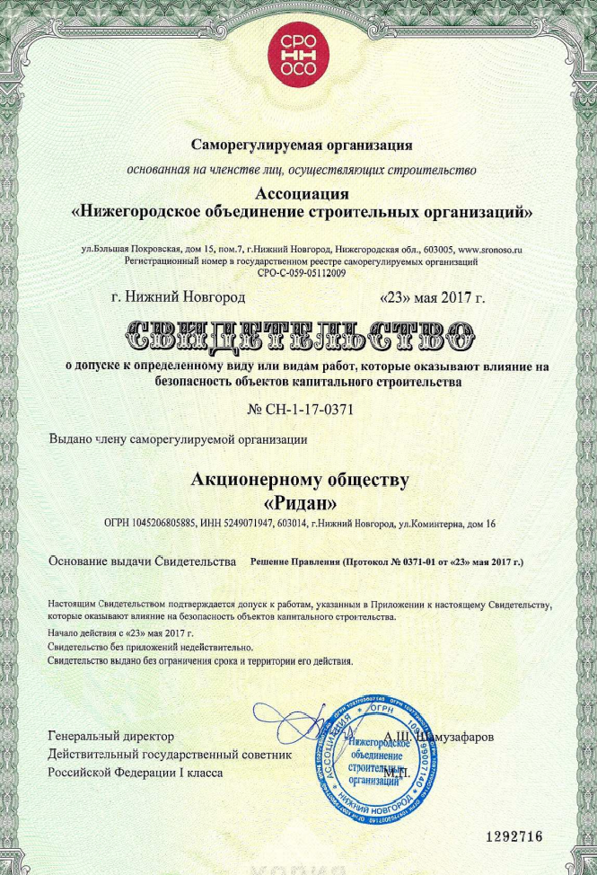 В конце мая АО «Ридан» получило новый допуск СРО к видам работ, которые оказывают влияние на безопасность объектов капитального строительства.