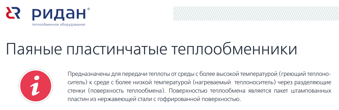 Также обновлена листовка «Паяные пластинчатые теплообменники «Ридан»: актуализирован типоразмерный ряд паяных теплообменников, дополнена информация по поставкам теплообменников под заказ в нестандартном исполнении.