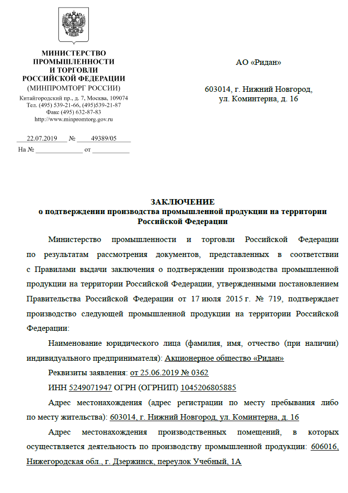 В июле 2019 года компания «Ридан» получила Заключение Минпромторга о подтверждении производства промышленной продукции на территории Российской Федерации.