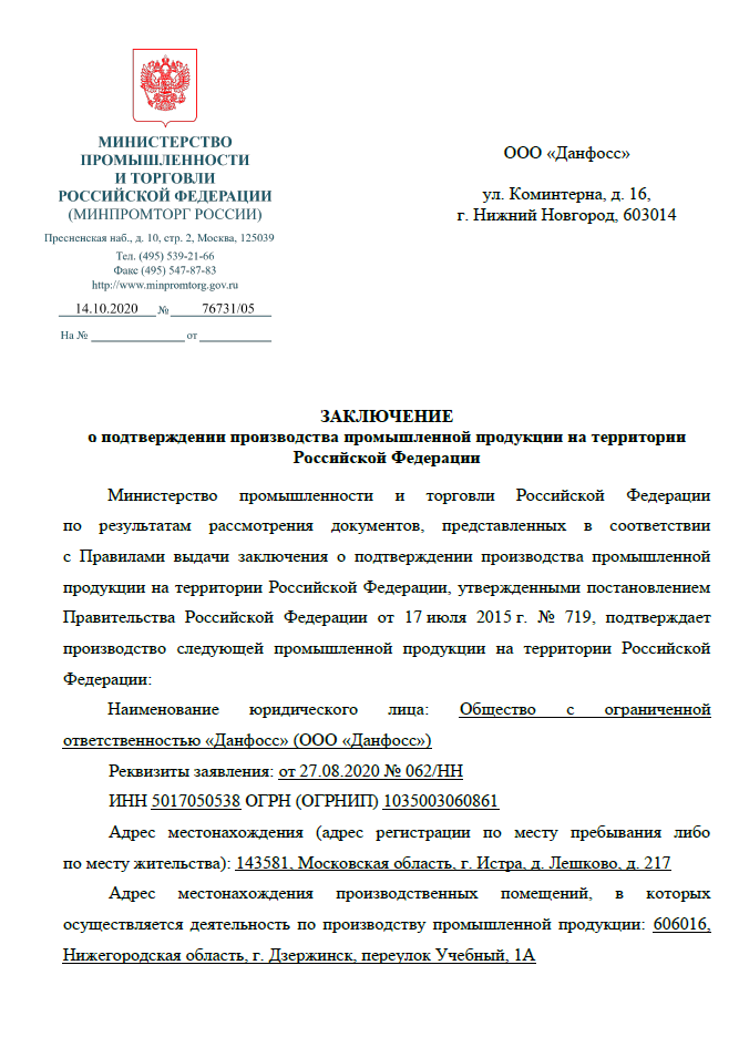 В 2020 году нами в очередной раз получено Заключение Минпромторга о подтверждении производства промышленной продукции на территории Российской Федерации.