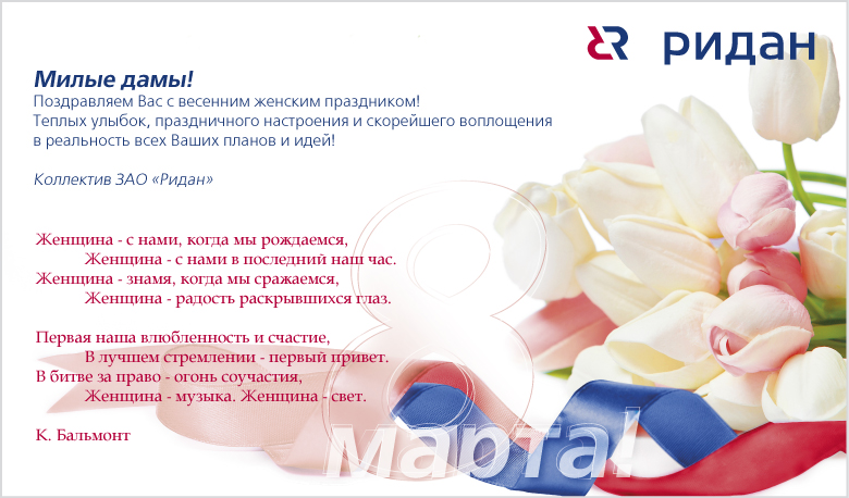 Милые дамы! Коллектив ЗАО «Ридан» поздравляет Вас с весенним праздником 8 марта!